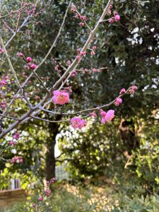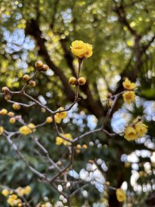冷たい風の中でも、今年はあちこちの庭先で、ことのほか、真っ赤な実で枝がたわむ南天の姿が見られました。そして今、ロウバイと紅梅が満開です。